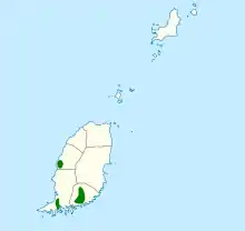 Grenada doves have been documented in south-western Grenada within the Mount Hartman, Clark's Court Bay, and Richmond Hill watersheds (Blockstein 1988, Blockstein and Hardy 1989).[8][9][16] The Mount Hartman watershed has received the greatest amount of scientific investigation and is considered by other researchers to be the representative habitat for the species (Blockstein 1988, Blockstein and Hardy 1989).[8] Part of this watershed has been designated as a national park and is the only official national park in Grenada. Grenada doves also have been recorded from western Grenada (Blockstein 1988, Blockstein and Hardy 1989).[8][9]