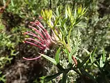 The flowers are arranged in one-sided, "toothbrush"-like group, 3–10 cm (1–4 in) long. The small sepals and petals are pale green to grey and hairy on the outside and glabrous inside. The style is 20–28 mm (0.8–1 in) long and red, tipped with a green pollen presenter. Flowering occurs throughout the year but mainly from October to February and the fruit that follows is a hairy follicle with reddish markings.[3][4][5][6]