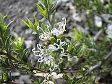 Grevillea alpivaga is an erect to prostrate shrub that typically grows to a height of 0.7–1 mm (0.028–0.039 in) high and has ridged branchlets. Its leaves are crowded, linear, often curved, 8–25 mm (0.31–0.98 in) long and 0.8–1.4 mm (0.031–0.055 in) wide, the edges rolled downwards and the lower surface silky-hairy. The flowers are in sessile groups about 100 mm (3.9 in) long on the ends of branches and are pale green to creamy-white with a white to pink style. The perianth is silky-hairy on the outside, the pistil is 6.5–7 mm (0.26–0.28 in) long . Flowering mainly occurs from October to February and the fruit is slightly warty follicle about 9 mm (0.35 in) long.[3][4][5] This species is similar to G. gariwerdensis that has less crowded leaves and a pistil 7.0–8.5 mm (0.28–0.33 in) long, and to G. neurophylla subsp. neurophylla that has longer leaves with a convex upper surface.[5]