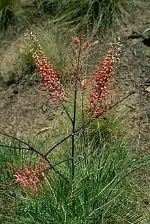 - Grevillea dryandri R.Br. subsp. dryandri[11] has leaves with 6 to 32 linear lobes 68–180 mm (2.7–7.1 in) long, 1.3–4 mm (0.051–0.157 in) wide and usually not paired, red, sometimes cream-coloured to white flowers with a red or paler style mostly from January to May, and fruit that is sticky but glabrous;[12][13][14]