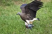 The grey-headed fish eagle (Icthyophaga ichthyaetus) is a fish-eating bird of prey from South East Asia.[2] It is a large stocky raptor with adults having dark brown upper body, grey head and lighter underbelly and white legs.[3] Juveniles are paler with darker streaking. It is often confused with the lesser fish eagle (Icthyophaga humilis) and the Pallas's fish eagle. The lesser fish eagle is similar in plumage but smaller and the Pallas's fish eagle shares the same habitat and feeding behaviour but is larger with longer wings and darker underparts. Is often called tank eagle in Sri Lanka due to its fondness for irrigation tanks.[4]