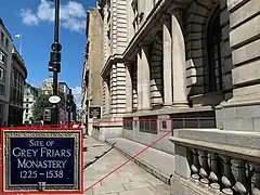 In London, the Greyfriars was a Conventual Franciscan friary that existed from 1225 to 1538 on a site at the North-West of the City of London by Newgate in the parish of St Nicholas in the Shambles. It was the second Franciscan religious house to be founded in the country.[1] The establishment included a conventual church that was one of the largest in London; a studium or regional university; and an extensive library of logical and theological texts. It was an important intellectual centre in the early fourteenth century, rivalled only by Oxford University in status. Members of the community at that time included William of Ockham, Walter Chatton and Adam Wodeham. It flourished in the fourteenth and fifteenth century but was dissolved in 1538 at the instigation of Henry VIII as part of the Dissolution of the Monasteries. Christ's Hospital was founded in the old conventual buildings, and the church was rebuilt completely by Sir Christopher Wren as Christ Church Greyfriars after the original church was almost completely destroyed in the Great Fire of London of 1666. The building now standing on the site, designed by Arup Group Limited, is currently occupied by Merrill Lynch.