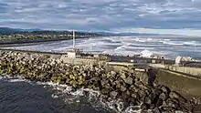 Köppen-Geiger climate classification system classifies its climate as oceanic (Cfb).[3] The mean annual rainfall Greymouth receives is high by New Zealand standards and is distributed relatively evenly throughout the year.[4] This is due to its position receiving marine westerlies throughout the year that often do not rise above the Southern Alps. As a result, it creates a rain shadow effect that sees east coast locations having far sunnier and warmer summers. This extreme marine influence also shelters the Greymouth area from hot summer days and cold winter nights. Snow is rare, with the last reported event occurring on 4 August 2019.[5]