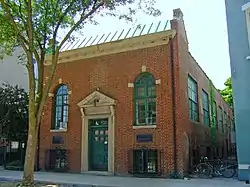 For the new Grimm Bindery, Small designed a small shop in Georgian Revival style,[3] similar in style to Ben Franklin's printing shop in Philadelphia.[5] The building is one story on a raised basement, with walls clad in red brick. The front door is centered, framed in classically-styled concrete beneath a small pediment. On each side is a large window with a round arch at the top. Topping the wall is a metal cornice decorated with modillions, beneath a short gable roof facade with a stepped parapet on each end, somewhat like Federal style. Above the front door is a neo-colonial-style sign proclaiming "Grimm BOOK BINDERY." Inside, the front door opened to a staircase which led up to an office on the left and the binding room on the right. The basement held a sewing room.[3]
