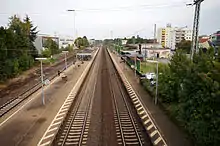 Groß Gerau station is located approximately 500 metres north of the centre of the town of Groß-Gerau in the German state of Hesse on the Rhine-Main Railway, running from Wiesbaden and Mainz to Darmstadt and Aschaffenburg. A curve branches off near the station connecting to the nearby Groß-Gerau-Dornberg station on the Mannheim–Frankfurt railway. The station is classified by Deutsche Bahn as a category 5 station.[1] The station name has no hyphen unlike the town it is in, following a Prussian government order of 1910,[4] which applied because of Prussian finance for the line, even though the station was in the Grand Duchy of Hesse.