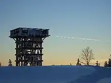Between 1999 or 2001 and 2017 or 2018, a wooden observation platform stood at the summit of the Großer Finsterberg.[2] As of June 2018, there are plans to reinstate the tower.[3] The original tower gave views of the Kickelhahn, the Ringberg on the Adlersberg near Suhl, the Dolmar near Meiningen and the only two mountains in Thuringia that are higher — the Großer Beerberg (983 m) and the Schneekopf (978 m) — below whose summits the Schmücke may also be seen. On the east side there is a small hut with another observation point.