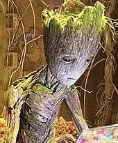 Groot is a fictional character voiced by Vin Diesel and portrayed in various forms and capacities via motion capture by Diesel, Krystian Godlewski, Sean Gunn, James Gunn and Terry Notary, in the Marvel Cinematic Universe (MCU) media franchise, based on the Marvel Comics character of the same name. A tree-like extraterrestrial humanoid known as a flora colossus, the character is a member of the Guardians of the Galaxy and a close associate of Rocket in particular. The initial incarnation of the character sacrifices himself to save his allies during the battle against Ronan the Accuser at the climax of the first film, leaving behind a sapling which grows into a new Groot, colloquially known as "Baby Groot" and differentiated offscreen by James Gunn as the original's "son".[1][2] Raised by Rocket as an adoptive son, the new Groot gradually grows to a similar size as his predecessor over the course of his next several appearances. He participates in the conflicts against Ego and then Thanos, falling victim to the Blip before being resurrected five years later by the Avengers and participating in the final battle against Thanos before departing for space with the Guardians. After the Guardians defeat the High Evolutionary, Groot continues to serve on the team, now under the command of Rocket.