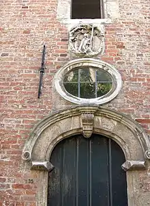 The beguinage of Leuven has the appearance of a small town on its own, with houses planned along a network of narrow streets and small squares. This is in contrast to the beguinages of Bruges and Amsterdam, where all houses face a central courtyard. The only large greenyard, on the left river bank, resulted from the demolition of some houses in the 19th century. Five houses date back from the 16th century, three of which still show timber framing. The house of Chièvres was built in 1561, in accordance with the will of Maria van Hamal, widow of William de Croÿ, duke of Aarschot and advisor in political affairs of Emperor Charles V. The characteristic tented roof with the onion-shaped top, refers to the two towers of the duke's castle in Heverlee (today known as Arenberg Castle).