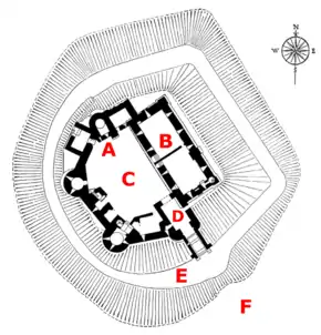 The hall block is a pilaster-buttressed, two-storey building, 96 by 32 feet (29.3 by 9.8 m) across, with the floors originally linked by a spiral staircase.[32] The first floor of the block contained the hall and a solar room separated by a wooden divide; the hall had a fireplace in the middle of its exterior wall, with two large windows on either side.[33] The ground floor had two service rooms lit by narrow loop windows.[32] An external wooden staircase would have led up directly into the main hall from the inner ward.[34] The block would have closely resembled de Burgh's hall at Christchurch Castle in Dorset.[35]