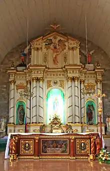 The present brick and stone church is Barn-style Baroque architecture, typically seen in many Spanish-era churches in the Philippines. The facade has two levels topped with a pediment bearing volutes that contrast with the slender columns.[1] Specially notable about the embellishments on the facade are embossed shells found at the base of the pediment and plant motifs found in the retablo on the pediment. Attached to the right of the church is a 5-level octagonal bell tower. The church measures 60 metres (200 ft) long, 16 metres (52 ft) wide and 12 metres (39 ft) high and is built in a cruciform manner.[1]