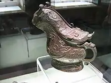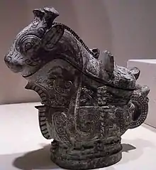 The Guang is distinguishable by its zoomorphic lid and handle, and its one-footed base.[4] The animal figure at the front of the lid is often a tiger or dragon, while the sculpted handle ranges in decoration from fantastic creatures such as dragons to real animals such as rams, elephants, and the beaks of birds.[5] Some guang lids also depict animals, typically birds, at the back of the vessel facing or transitioning into the handle. The animals on the lid and handle are presented "in the round".[6]