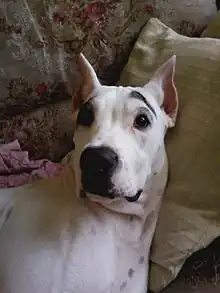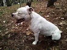The Guatemalan Dogo is a type of mastiff. It is a medium-sized, robust, strong and agile dog with an appearance similar to the Dogo Argentino and the Dogue Brasileiros - however, these breeds are not closely related, but only share partially same ancestors. Males are 54 – 60 cm tall and weigh 40 – 45 kg; females 52 – 58 cm tall and weigh 35 – 40 kg. The short, shiny coat has a smooth and hard texture. The colour must always be white in the body, but in the head markings or spots of any other colour are preferred (although not required).[1]