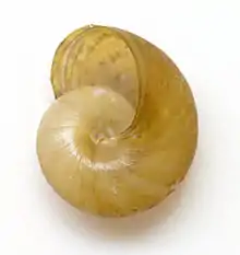 The shell of adult snails is 14.4–21.4 mm in height, with a diameter of 24.4–38.4 mm, depressedly turbinate with an angular whorl profile, sculptured with microscopic grooves and radial growth lines. It is yellowish-brown in colouration. The umbilicus is closed by reflection of the columella. The aperture is ovately lunate. The animal is yellow-brown to dark brown with spots on the side of the tail, dark bands on the neck and a small caudal horn.[2]