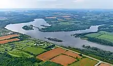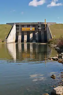 The dam at Guelph Lake is one of the main flood control installations on the Speed River. Each spring, melt-water runoff and seasonal precipitation is collected in the reservoir; during the summer, water is released slowly to regulate the flow of the river; and in autumn, the lake is drained to a much lower level, before it freezes over (partially or completely) during the winter. There is a small hydroelectric power generating facility at the dam which produces 100 kilowatts (KW) of power.[3]