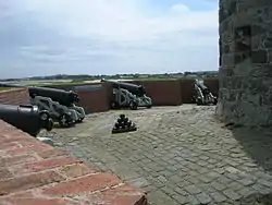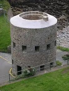 In 1778, General Henry Seymour Conway, Governor of Jersey, recommended that 30 towers (see Jersey Round Tower) be built there to impede a possible French incursion. As it happened, almost all the towers were built after the Battle of Jersey in 1781. However, in July 1778, the British government also authorized the building of 15 towers on Guernsey.[1] These towers were designed to accommodate only muskets (i.e., there was no provision for artillery); though there was discussion of giving each tower a Coehorn mortar for the roof platform nothing came of this.[2]