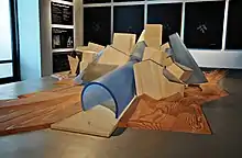 The museum is planned, at 320,000 square feet (30,000 m2), to be the Solomon R. Guggenheim Foundation's largest facility. It is designed to accommodate approximately 130,000 square feet (12,000 m2) of exhibition space.[1][13] Gehry's design features exhibition galleries, education and research space, a conservation laboratory, a center for contemporary Arab, Islamic and Middle Eastern culture, and a center for "art and technology".[12] Inspired by traditional middle-eastern covered courtyards and wind towers, used to cool structures exposed to the desert sun, the museum's clusters of horizontal and vertical galleries of various sizes are connected by catwalks and planned around a central, covered courtyard, incorporating natural features intended to maximize the energy efficiency of the building. The largest galleries will offer a grand scale for the display of large contemporary art installations.[12] Parts of the building will be four stories tall with galleries stacked atop each other.[13] The museum is intended to be a centerpiece in the island's plan for contemporary art and culture".[14]