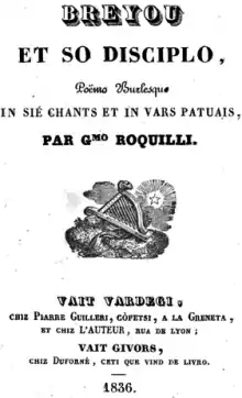 Guillaume Roquille published two long texts in patois at Rive-de-Gier: Breyou et so disciplo (1836) and Lo Pereyoux (1840). These are difficult to find today. At that time, writing poetry in the patois used in day-to-day speech was very unusual, and publishing without a translation was a bold step. Educated people often though of patois as being suitable only for jokes or comic plays.[4] Although he knew French well, he chose to write in dialect to have a more direct effect on his audience, for his work was clearly intended to be read aloud.[2]