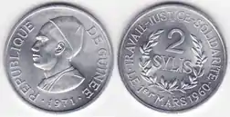 The syli was the currency of Guinea between 1971 and 1985. It was subdivided into 100 cauris. The Maninkakan word syli means "elephant", while cauri refers to the shells formerly used as currency. The syli replaced the Guinean franc at a rate of 1 syli = 10 francs.