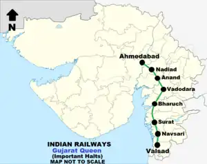 The 19033 / 19034 Gujarat Queen is an Express train belonging to Indian Railways that run between Valsad and Ahmedabad Junction in India. It operates as train number 19033 from Valsad to Ahmedabad Junction and as train number 19034 in the reverse direction.[1][2][3][4]