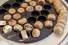 Gukhwa-ppang (국화빵; "chrysanthemum bread") is a flower-shaped pastry stuffed with sweetened red bean paste.[1][2][3] It is a warm street food sold throughout Korea. It is grilled in an appliance similar to a waffle iron, but with flower-shaped molds.