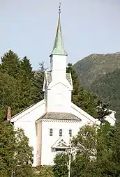 Gulen Church (Norwegian: Gulen kyrkje) is a parish church of the Church of Norway in Gulen Municipality in Vestland county, Norway. It is located in the village of Eivindvik. It is the church for the Gulen parish which is part of the Nordhordland prosti (deanery) in the Diocese of Bjørgvin. The white, wooden church was built in a long church design in 1863 using plans drawn up by the architect Georg Andreas Bull. The church seats about 700 people.[1][2] The church stands on a hill in central Eivindvik, with magnificent views towards the Gulafjorden.