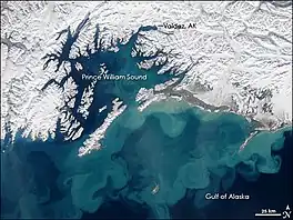 ![]() A view of the Gulf of Alaska from space, showing swirling sediment in the waters | |