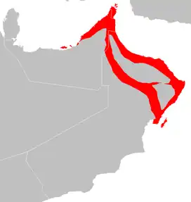 The Gulf of Oman desert and semi-desert is a coastal ecoregion on the Persian Gulf and the Gulf of Oman in Oman and the United Arab Emirates at the northeastern tip of the Arabian Peninsula. The climate is hot and dry, with gravelly plains and savanna with thorny acacia trees inland from the coast. Along the coast there are mixture of habitats that include mangrove swamps, lagoons and mudflats. The mangrove areas are dominated by Avicennia marina and the savanna by Prosopis cineraria and Vachellia tortilis. Masirah Island is an important breeding area for the loggerhead sea turtle and other sea turtles also occur here, as well as a great variety of birds, some resident and some migratory. There are some protected areas, but in general the habitats have been degraded by the grazing of livestock, especially camels and goats; they are also at risk from oil spills, off-road driving and poaching.[3]