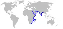 The Gulf torpedo is the most widespread of the electric rays in the western Indian Ocean, with a patchy range extending to South Africa, Somalia, the Red Sea, the Arabian Sea, the Persian Gulf, Sri Lanka, and the Andaman Sea. There are also less reliable reports of it occurring elsewhere, including Madagascar, the Seychelles, and the Laccadive Islands.[3] Recorded for the first time in 2002 in Mediterranean Sea, its presence needs to be clarified due to its strong resemblance with Torpedo marmorata, a species well established there.[4] It is found in shallow waters in sandy areas, on and near coral reefs, and offshore to a depth of 150 meters.[1] It often buries itself in the sandy bottom of gullies and estuaries.[2]