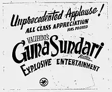 Gunasundari Katha is a 1949 Indian Telugu language fantasy film produced and directed by K. V. Reddy, starring Sriranjani, Kasturi Siva Rao, Santha Kumari. The script was written by Pingali Nagendra Rao, K. V. Reddy, and Kamalakara Kameswara Rao. Kameswara Rao was also the associate director.[1] William Shakespeare's play King Lear was the inspiration for the core plot.[2] However the writers changed the tone from the tragedy of King Lear to a more entertaining one for the film.[1] The film was commercially successful.[3][1]