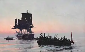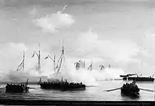 ![]() Danish privateers intercepting an enemy vessel during the Napoleonic Wars, a painting by Christian Mølsted depicting an unspecified engagement in the Gunboat War | |||||||||