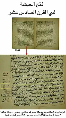 The Gurgura are mentioned in the Futuh Al Habasha : Conquest of Abyssinia as source dating back as far as the 16th century, by author: Shihabudin Ahmad bin Abd al-Qadir 'Arab Faqih or 'Arab Faqih. It is recorded that the Gurgure were among the famous Somali spearmen led by their chief Garad Abdi who fought alongside Ahmed Gurey or Ahmad ibn Ibrahim al-Ghazi with thirty knights and one-thousand foot-soldiers .