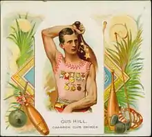 On 16 June 1876, when Hill was eighteen, he was listed as a club swinger on a bill for a vaudeville show at Tony Pastor's theater in New York. The show featured the "great Leonzo Brothers and their celebrated dog, Tiger."[6] He would travel around the country challenging local jugglers to compete. On his first appearance he would let the local win. He would challenge them to a repeat match when he returned, ensuring a full house, and would then defeat the local. He gained the title of "Champion Clubman of the World". There was some sharp practice involved, but the title was useful in his variety act billings.[3][lower-alpha 2]