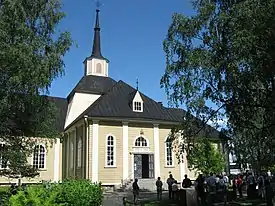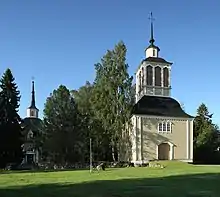 The Gustav Adolf Church is the third church building in the history of the parish; the first church was destroyed in a fire in 1700 and the second was demolished due to its poor condition after the present church was completed.[1] Drawings for the third wooden church were obtained from the Superintendent Office of Stockholm, and the construction work started in 1778 was carried out under the direction of Simon Silvén, a church builder and master builder from Kalajoki, in 1779–1780.[4] The church was consecrated by Pastor Johan Lagus on March 5, 1780.[3]