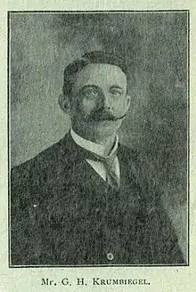 Krumbiegel was born in Lohmen near Dresden, and his early studies were in Wilsdruff and Dresden after which he trained in horticulture in Pillnitz. In 1884 he worked in Schwerin and from 1885 to 1887 he worked as a landscape gardener in Hamburg. In 1888, he moved to England, designing flower beds at Hyde Park and became a staff at the Royal Botanical Gardens in Kew.[2] He then took up a position in 1893 with the princely state of Baroda as Curator of the botanical gardens after the retirement of J.M. Henry (1841-1937).[3] He also worked with the Government Botanical Gardens at Ootacamund and was responsible for redesign of the architecture. In 1907 he took a better offer[4] from Krishnaraja Wodeyar, the ruler of Mysore to serve him and he succeeded John Cameron at the Lal Bagh Gardens as an economic botanist and superintendent. He introduced numerous plants and was involved in the design of the Brindavan Gardens which revived the Mughal style of gardening. He was also involved with the Mysore Horticultural Society that was started in 1912. Although outside his key work area, he was often involved in architectural design.[5] The Dewan of Mysore appointed him as an architectural consultant despite protests from the British Resident in Mysore. During the Second World War, Germans in India were declared as enemies and Krumbiegel was, along with other Germans, held at an internment camp in Bangalore.[6][7] As a consulting architect, he introduced regulations for protection of old monuments, and examined designs of new buildings including the guesthouse for the Maharaja of Mysore, a pavilion in the municipal park of Kolar and for the British Residency at Quetta. He also served as a Visiting Professor of Architecture and Civic Design at the College of Engineering of Mysore.
