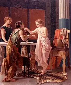 His his first exhibition at the Society for the Promotion of Fine Arts was held in 1864. He would continue to exhibit with them regularly until 1884. During those years, he created several works in the Orientalist genre, most of which were judged very harshly.[1] Some historical scenes were purchased by the province of Naples. In the late seventies, he began to exhibit more widely; in Rome, Milan and Turin, including Rome's International Art Exhibition of 1883, where he presented a portrait of Queen Margherita of Savoy.[3]