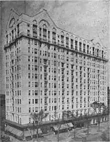 In 1892, Sidenberg had purchased the old Hotel Winthrop on 7th Avenue between 124th and 125th streets in Harlem. In 1912, the Winthrop was demolished and replaced by a new building designed by brothers George & Edward Blum; the thirteen-story building was originally planned as a residential hotel with most rooms constructed as suites for long-term residents. Stores occupied the ground floor. When built, it was praised as the tallest structure in Harlem. The new hotel was named in honor of his two wives, Hotel Theresa. The building, which survives as the Theresa Towers, later became a center of the Harlem Renaissance[8] and is now on the National Register of Historic Places.[9] It has become a regular stop on commercial tours of Harlem.