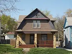The Gustov C. Lerch House was designed in a combination of the Shingle and Colonial Revival styles. The house is distinguished by its cross gambrels and the variety of surface textures that were employed in its construction. The foundation is composed of quarry-faced stone, the main level is composed of tan brick with segmented widow arches and corners in dark, rock-faced brick.[2] The upper level is composed of gambrels that are covered in narrow clapboard. There is a pentroof across each gable on the attic level. An Adamesque oval window is located at the top of the main gable. There is an identical house in Davenport's Oak Lane Historic District.[2]