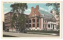 The Guthrie Corning Hospital is a rural hospital and Level III trauma center in Corning, New York. It opened June 4, 1900 at the Stearns House at East First and Chemung Streets.[1] This was after a January 25 meeting at which the woman of the city considered organizing a hospital association.[2] It initially opened with 9 beds, but today has 65 private patient rooms at the new facility opened in July, 2014, ten years after being acquired by Guthrie. In the transition, the hospital built the Guthrie Corning Cancer Center, a physical rehabilitation building, Guthrie HealthWorks Wellness & Fitness Center, and a same day surgicenter in Big Flats, New York.[1] It received a provisional trauma center designation August 28, 2023.[3][4]