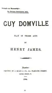 Guy Domville is a play by Henry James first staged in London in 1895. The première performance ended with the author being jeered by a section of the audience as he bowed onstage at the end of the play. This failure largely marked the end of James's attempt to conquer the theatre. He returned to his narrative fiction and recorded this memorable pledge in his Notebooks on 23 January 1895: "I take up my own old pen again – the pen of all my old unforgettable efforts and sacred struggles. To myself – today – I need say no more. Large and full and high the future still opens. It is now indeed that I may do the work of my life. And I will."