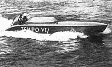 Lombardo's talents also extended beyond the realm of jazz music. He was also an active nautical enthusiast and participated in the sport of Step Boat speedboat racing.[46] In 1946, he piloted his speedboat "Tempo VI" to victory, winning the Gold Cup. For a time, Lombardo even reigned as the U.S. national champion (1946-1949), utilizing a boat designed specifically for him and manufactured by John L. Hacker. He subsequently achieved victory in several other important races including: the Ford Memorial competition (1948), President's Cup (1952) as well as the Silver Cup in 1952. By the late 1950s, Lombardo had won every trophy in the field and retired from active competition.[46] This followed his attempt in 1959 to utilize a jet engine-powered Tempo Alcoa to exceed the absolute water speed record. During a test run, the radio-controlled craft was destroyed while it surpassed a velocity of 250 mph.[47][48] These numerous achievements led to his induction into the Canadian Motorsport Hall of Fame in 2002.[46]