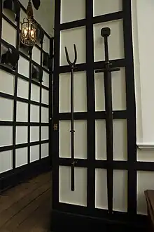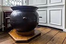 Guy was transformed in the fourteenth century with a spate of metrical romances written in Middle English. The versions which we possess are adaptations from the French, and are cast in the form of a roman; the adventures open with a long recital of Guy's wars in Lombardy, Germany and Constantinople, embellished with fights with dragons and surprising feats of arms.[4] The name Guy entered the Beauchamp family, earls of Warwick, when William de Beauchamp IV inherited the title in 1269 through his mother's brother, named his heir "Guy" in 1298. A tower added to Warwick Castle in 1394 was named "Guy's Tower", and Guy of Warwick relics began to accumulate,[7] including the reputed Guy of Warwick's Sword, Sir Guy's fork (believed to be a historic military fork), and large cauldron known as Sir Guy's "Porridge Pot" (believed to be a large garrison crock of the sixteenth century).[8] Queen Elizabeth I is alleged to have paid for these relics to be guarded.[9]