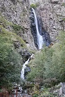 Behind the Gveleti Bridge there is a deep but short gorge, at the end of which a mountain stream, originating between the Arch-kort and Sarcevis ridges, falls in two cascades from a height of just over 20 meters. The distance from the Gveleti Bridge to the waterfall is 0,75 km with a large climb.