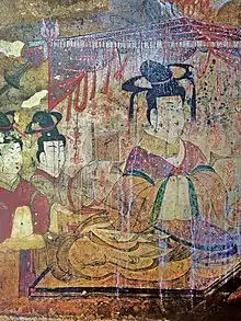 Illustrations of maids from the same tomb are also depicted wearing clothing attire which are similar to those worn from the North and South dynasties of China to the Tang dynasty the clothing attire of these maids are different from the one worn by the maids in the murals in Ji'an.[15]:16 Moreover, Goguryeo, influenced by the Chinese, also developed the ritual of bestowing attire to smaller entities, such as Silla, which in turn did so to other smaller entities.[9]