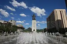 Gwanghwamun Square[2][3][4][5] (also known as Gwanghwamun Plaza; Korean: 광화문광장; Hanja: 光化門廣場) is a public square on Sejongno, Jongno-gu, Seoul, South Korea.[6] Serving as a public space and at times road for centuries of Korean history,[7] it also historically significant as the location of royal administrative buildings, known as Yukjo-geori or Street of Six Ministries;[8] and features statues of Admiral Yi Sun-sin of Joseon Dynasty and King Sejong the Great of Joseon.[9]