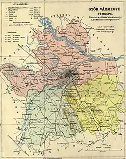 Győr county (in Hungarian: Győr (vár)megye) was an administrative county (comitatus) of the Kingdom of Hungary, situated mostly on the right (south) side of the Danube river. Its territory is now part of Hungary, except seven villages on the left side of the Danube which belong to Slovakia. The capital of the county was the city of Győr.