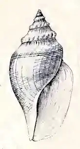 (Original description) The shell is moderately large, stout and ovate. The body whorl is very large in proportion to the rest of the shell. Some of the upper whorls are ribbed and nodulous, while the two lower whorls have only spiral lines and lines of growth. The shell contains about eight whorls, three of which form a chestnut-colored protoconch. About three whorls below the protoconch are covered with prominent, longitudinal ribs, which form a well marked shoulder and are crossed by several conspicuous, revolving cinguli and grooves, which render them decidedly nodulous. The subsutural band is broad, strongly concave, occupying nearly or quite half the breadth of the upper whorls, and is crossed by strongly receding, raised lines, parallel with the lines of growth of the sinus, but without spiral lines. The body whorl is large and swollen, covered throughout with very evident lines of growth, which are crossed, except on the subsutural band, by conspicuous, revolving cinguli, which are separated by spaces considerably exceeding their own breadth. The aperture is oblong-ovate, scarcely narrowed at the broad, short, open siphonal canal, and with a very wide and rather deep posterior sinus. The outer lip is thin and projects well forward beyond the sinus in a broadly rounded curve. The columella is straight, with a sinuous inner margin. The inner lip is marked by a narrow and thin enamel, which extends but little forward in a sinuous outline. The color is yellowish white under a thin, smooth, glossy, yellowish green epidermis.[2]