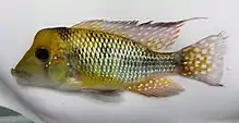 Gymnogeophagus pseudolabiatus is a species of geophagine cichlid. It inhabits parts of the Uruguay and Río Negro rivers. It is characterised by the absence of supraneural bones, the presence of a forward spine in its first dorsal fin pterygiophore, the absence of an oblique bar between the eye and nape, possessing a black marking near the dorsal fin origin that projects to its dorsum, as well as other features.[1]