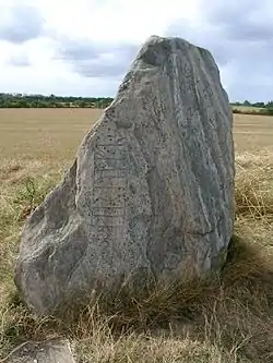 The Hærulf Runestone dates from the 10th century and is classified as being carved in runestone style RAK. This is the classification for inscriptions with runic bands that have straight ends without any attached serpent or beast heads. The stone was originally located at Øster Løgum[1] near the north-south Jutland highway. It is notable not only for its short inscription,[2] which is the name Hærulf, but for having been taken to Berlin as war booty in 1864. It was not until 1952 that the stone was returned to Denmark near to its original location. Although the inscription only has a single word, a single dot, which is normally a punctuation mark used as a word divider, has been placed before and after the runes hairulfʀ for the name Hærulf.[3] This name is a shortened form of the Proto-Norse name Hariwulfa or Hariwulfʀ, which means either "Warrior-Wolf" or "War Host-Wolf," that is attested to on the Istaby and Stentoften Runestones.[4][5]