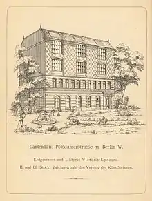 The first schools providing higher education for girls were founded at the beginning of the 18th century. The Gymnaecum, founded in 1709 by August Hermann Francke, is regarded as the first such institution.[1] In 1717, Catholic "Englische Fräulein" of the Congregation of Jesus founded institutions for girls in Bamberg.[2] In 1802, the first municipal school for girls was founded in Hanover, the "Städtische höhere Töchterschule". One of its teachers, Johann Heinrich Meier, founded in 1806 a private institution for girls in Lübeck, which existed until 1871.[3] In 1808, "Madame Wippermann", the wife of a merchant and manufacturer in Quedlinburg, founded the first private Höhere Töchterschule for 40 students, which expanded to the Städtische Höhere Töchterschule in 1863 and to today's Neustädter Grundschule Quedlinburg.