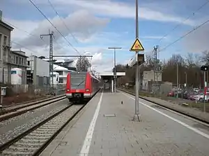 Höllriegelskreuth station - until 22 May 1977 called Höllriegelskreuth-Grünwald - had four tracks, one of them was used for freight transport. Since the electrification the station was the final stop of the electric motor coaches which circulated every 20 minutes. For this purpose, a separate locomotive shed, which was connected with other storage sidings, was established.[5] Even before the introduction of the S-Bahn operation, the demolition of the building took place. In 1978, Deutsche Bundesbahn tore down the old reception building and replaced it with a new building.[6]